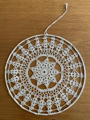 Gehäckeltes-Fensterbild. Handarbeit. Der Durchmesser 30 cm.